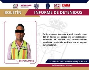 De acuerdo con autoridades de la Secretaría de Seguridad y Protección Ciudadana de Tabasco (SSPC), el detenido fue identificado como Arturo “N”, de 48 años, quien fue interceptado durante recorridos preventivos implementados en el área.