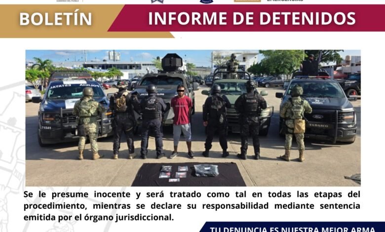 Leer más »VILLAHERMOSA (CONTRASTE POLÍTICO).-Un detenido, 25 años de edad y múltiples dosis de presuntas drogas aseguradas fue el saldo del operativo…